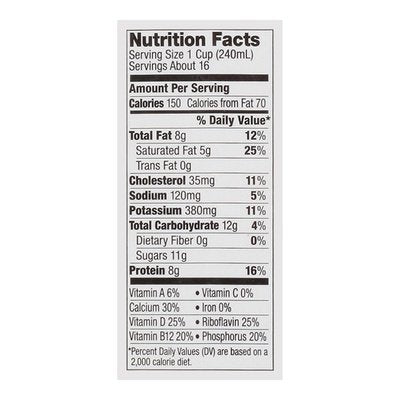 Wholemilk. 8 grams protein in every 8 oz glass. 150 calories per cup. USDA Organic. Certified Organic by Quality Assurance International. See nutrition info for fat and sat fat content. Vitamin D. Organic always means non-GMO. Produced without GMOs. No synthetic hormones (No significant difference has been shown between milk from rBST-treated & non rBST-treated cows). No antibiotics. Ultra-pasteurized. Processed and filled at plant stamped above. Grade A. horizon.com. Call 888-494-3020 or visit horizon.com.