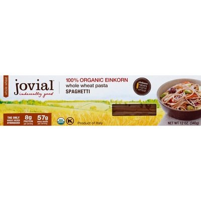 100% organic einkorn. Inherently good. Whole wheat. Einkorn nature's original wheat. The only wheat never hybridized. 9 g protein per serving. 57 g whole grains per serving. USDA organic. Einkorn: unchanged for 12,000 years. Modern wheat: bred for higher yields and strong gluten. From ancient grains, a healthier future. Einkorn is the original wheat, genetically pure and just as nature intended. With more protein than any other grain, einkorn is a nutritional powerhouse that leaves you feeling satisfied without weighing down your digestion. Scan This: Learn about ancient einkorn wheat and see how this pasta comes to life. Harvest health from history: Neolithic farmers sowed wild einkorn seeds 12,000 years ago. Einkorn is the oldest food to make it back today's table. For a future of wellness, choose authentic foods form the past. Caring about the environment. Box - (80%) recycled content, please recycle. Window - FSC wood pulp & certified home compostable. Detach & discard with kitchen waste. Certified organic by QAI. jovialfoods.com. 100% Whole Grain: 57 g or more per serving. Eat 48 g or more of whole grains daily. WholeGrainsCouncil.org Product of Italy.