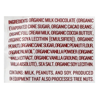 INGREDIENTS: organic milk chocolate (organic evaporated cane sugar, organic cocoa butter, organic whole milk powder, organic chocolate liquor, organic soy lecithin, organic vanilla), organic peanuts, organic powdered evaporated cane sugar, organic palm fruit oil, organic peanut flour, organic cocoa butter, organic vanilla flavor, sea salt, organic soy lecithin.
