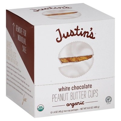 Two-cup packages. USDA organic. Rainforest Alliance certified cocoa. Made with Justin's peanut butter. About Justin's: This product was made with common sense. A sense that cooking in small batches ensures higher quality. That selectively choosing fine, naturally delicious ingredients will make it taste better. And no matter what their size, companies should always take care of their customers, their community and the environment. Justins.com. Certified organic by Oregon Tilth. Gluten free. White Chocolate Peanut Butter Cups: Are you white chocolate curious? Do you outwardly claim to be against it, but secretly wish you could try it again - like that one time in college? Well, now's your chance. I've combined my rich and creamy organic peanut butter with delicious Rainforest Alliance Certified chocolate to create a treat even the most staunch chocolate conservative will love. - Justin. Made with Justin's peanut butter. Find our delicious flavors in the natural peanut butter aisle. This carton was made with wind energy and use zero VOC inks. This carton is made from 100% recycled paper.