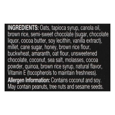 Made with 5 sugar grains (Oats, millet, buckwheat, amaranth, quinoa). 5 g sugar. 0 g trans fat. Gluten free. 100% whole grains. 20 g per serving. No genetically engineered ingredients. Non GMO Project verified. nongmoproject.org. Chewy with a crunch. Ingredients you can see & pronounce. Welcome to the Kind community! Here at Kind, we think a little differently. Instead of or we say and. We choose healthy and tasty, convenient and wholesome, economically sustainable and socially impactful. From the snacks and foods we make, to the way we work, live, and give back, our goal is to make Kind not just a brand, but also a state of mind and community to make the world a little kinder. Kindly yours, - Daniel Lubetzky, Kind Founder. At Kind, we obsess over developing delicious snacks that use as little sugar as possible, without artificial sweeteners or sugar alcohols. Take this bar for example - made with tasty chocolate chunks, whole super grains, and 5g of sugar, it's a snack you can feel good about, anytime and anywhere. Cocoa powder. 100% whole grain oats. Dark chocolate. Do the kind thing for your body, your taste buds & your world. 5 Super Grains: Oats, millet, buckwheat, amaranth, quinoa. kindsnacks.com. Instagram. Twitter. Facebook. (at)kindsnacks. Learn more at kindsnacks.com. FSC: Recycled – Packaging. Recycle this carton. Made in U.S.A. with domestic and imported ingredients.