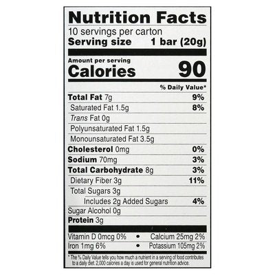 90 calories. 3 g sugar. 7 g fat per bar. Gluten free. Dairy free. Low sodium. Low glycemic index. No sugar alcohols. Good source of fiber 7 g fat per bar. No genetically engineered ingredients. No. 1 ingredient almonds. Ingredients you can see & pronounce. Do the kind thing for your body, your taste buds & your world. kindsnacks.com. Instagram. Twitter. Facebook. (at)kindsnacks. FSC: Mix - Packaging. Recycle this carton. Made in U.S.A with domestic and imported ingredients.