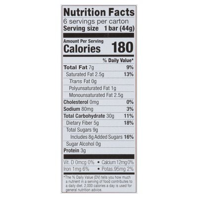 0 g trans fat. 7 g fat per bar. Sustained energy from 100% whole grains 17 g per bar. Gluten free. Low sodium. Good source of fiber. Non-GMO Project verified. nongmoproject.org. New. Oat milk. Plant-based drizzle. Crispy & light bite. Do the kind thing for your body, your taste buds & your world. Welcome to the Kind community! Here at Kind, we think a little differently. Instead of or we say and. We choose healthy and tasty, convenient and wholesome, economically sustainable and socially impactful. From the snacks and foods we make, to the way we work, live, and give back, our goal is to make Kind not just a brand, but also a state of mind and community to make the world a little kinder - Kindly yours, Daniel Lubetzky, Kind Founder. Enjoy on-the-go as part of a balanced breakfast. kindsnacks.com. Tell us your favorites & join the conversation: kindsnacks.com. (at)kindsnacks. Instagram. Twitter. Facebook. Recycle this carton. FSC: Recycled - Packaging made from recycled material. www.fsc.org. Made in USA with domestic and imported ingredients.