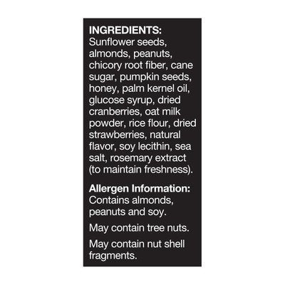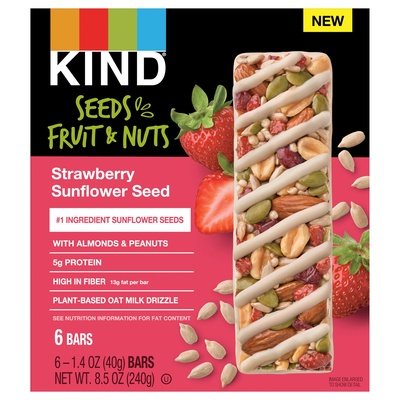 5 g protein. 13 g fat per bar. 0 g trans fat. Gluten Free. High in fiber. No sugar alcohols. Low sodium. See nutrition information for fat content. Non-GMO Project verified. nongmoproject.org. New. No.1 ingredient sunflower seeds. With almonds & peanuts. Plant-based oat milk drizzle. Ingredients you can see & pronounce. Do the kind thing for your body, your taste buds & your world. Welcome to the Kind community! Here at Kind, we think a little differently. Instead of or we say and. We choose healthy and tasty, convenient and wholesome, economically sustainable and socially impactful. From the snacks and foods we make, to the way we work, live, and give back, our goal is to make Kind not just a brand, but also a state of mind and community to make the world a little kinder. Kindly yours, Daniel Lubetzky, Kind Founder. We've added a new nutrient-dense No.1 ingredient to our bars - seeds! This flavor has chewy sunflower and pumpkin seeds mixed with sweet strawberries, cranberries and crunchy almonds & peanuts. Topped with a plant-based oat milk drizzle, these bars are the perfect snack to satisfy your sweet cravings. do the kind thing for your body, your taste buds & your world. kindsnacks.com. Instagram. Twitter. Facebook. (at)kindsnacks. Learn more at kindsnacks.com. Tell us your favorites & join the conversation: kindsnacks.com. Recycle this carton. FSC. www.fsc.org. MIX. Packaging. Supporting responsible forestry. Made in U.S.A. with domestic and imported ingredients.