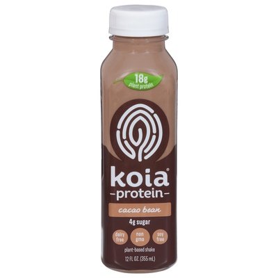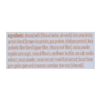 18 g plant protein. 4 g sugar. Dairy free. Soy free. Gluten-free. Vegan. Non-GMO Project verified. nongmoproject.org. Power plant protein. Shake it you gotta shake it like you mean it. Always with plant proteins proprietary complete protein blend of brown rice, pea and chickpea proteins with all9 essential amino acids to support your body's natural renewal and maintenance. Almonds an excellent source of protein, delivering antioxidants, fiber, plant-based fats and flavor. Infuses with cacao: a superfood delivering minerals and antioxidants; believed to aid in circulation and digestion. Vanilla: beloved for its delicious flavor and supply of antioxidants. Mmm - plants! Scan for more Koia goodness contest, news, recipes & more! Join our community & share how plants power you. Facebook. Instagram. (at)drinkkoia. Got a questions sprouting? info(at)drinkkoia.com. BPA free. Please recycle.