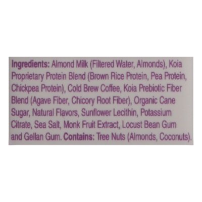 Plant-based shake. 18 g plant protein. 4 g sugar. 7 g prebiotic fiber. Dairy free. Soy free. Gluten free. Vegan. 110 mg caffeine. Non-GMO Project verified. nongmoproject.org. We're Koia Pronounced (Coy-Ah): Your new favorite Plant Protein Shake. We specialize in plant protein, but not that chalky stuff. Our shakes are sweet without the sugar, creamy without the dairy, and serves up a variety of nutrients without sacrificing deliciousness. So forget everything you think you know about plant protein, and get ready to be blown away by the true and tasty power of plants. Shake it like you mean it. From our very own complete protein blend of brown rice, pea and chickpea proteins with all 9 essential amino acids. From our very own fiber blend that nourishes your gut and supports your digestive health. Infused from our vibrantly smooth cold brew coffee. Tiktok. Instagram. Facebook. (at)drinkkoia. info(at)drinkkoia.com. BPA free. Please recycle.