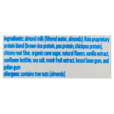 Plant-based shake. 18 g plant protein. 4 g sugar. Dairy free. Soy free. Gluten-free. Vegan. Non GMO Project verified. nongmoproject.org. Powered by plant protein. Always with Plant Proteins: Proprietary complete protein blend of brown rice, pea and chickpea proteins with all 9 essential amino acids to support your body's natural renewal and maintenance. Almonds: An excellent source of protein, delivering antioxidants, fiber, good fats and flavor. Infused with vanilla beloved for its delicious flavor and supply of antioxidants. Say hello to your new favorite milk-less shake! We've made this classic flavor even more fantastic by omitting excess sugar and junk so you can enjoy creamy deliciousness free from dairy, gluten and guilt! Join our community & share how plants power you. Facebook. Instagram. (at)drinkkoia. Got a question sprouting? info(at)drinkkoia.com. Please recycle.