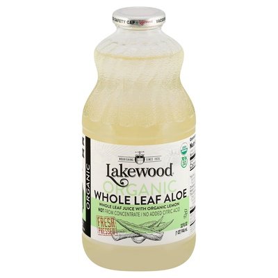 Whole leaf juice with organic lemon. USDA Organic. Certified Organic by Quality Certification Services (QCS). 100% vegan. Gluten free. Casein free. Non GMO. Nourishing since 1935. Feel good. Live good. Latex & aloin free (contains less than 5ppm aloin). No preservatives. Allergen free (Per FDA 8 major food allergens). Natural occurring sugars unsweetened in fruits/vegetables. www.lakewoodorganic.com. Facebook. Instagram. Pinterest. Glass recycles. All glass BPA/BPS DEHP free.