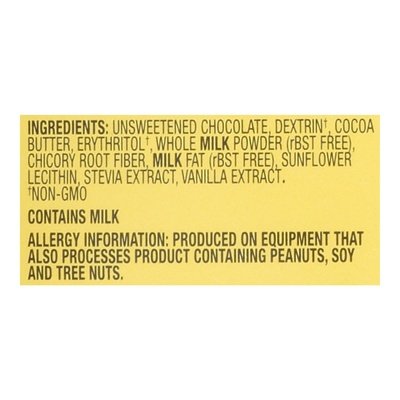 Certified gluten free. gfco.org. Not a low calorie food. See nutrition information for calorie and sugar content. Less sugar. Sweet life. 40% cocoa - Stevia sweetened. No sugar added. Sweet & creamy. Love Lily's Sweets? Give our baking chips a try! lilys.com. Certified Fair Trade by FLOCert. Cocoa and Vanilla: Mass balanced is used to match Fairtrade Sourcing. Visit www.info.fairtrade.net/net/sourcing.