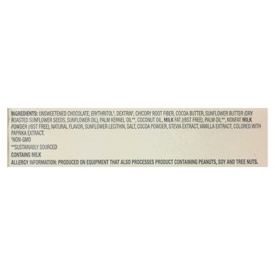 Certified gluten free. gfco.org. Not a low calorie food. See nutrition information for calorie & sugar content. New. Lilys - Less sugar. Sweet life. 55% cocoa - Stevia sweetened. No sugar added. lilys.com. Certified Fair Trade by FLOCert. Fairtrade cocoa and vanilla: mass balance is used to match fairtrade sourcing. Visit info.fairtrade.net/sourcing.
