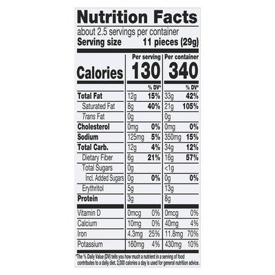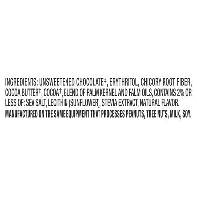 Chocolate with 70% cacao. 130 calories per 11 pieces. 1 g net carbs per serving. 12 g total carbohydrate - 6 g fiber - 5 g erythritol = 1 g net carbs per serving. Certified gluten free. No sugar added. See nutrition information for total fat and saturated fat content. Not a low calorie food. See nutrition information for calorie and sugar content. Non-GMO Project verified. nongmoproject.org. New rich & creamy recipe. lilys.com. SmartLabel: Scan or call 1-800-468-1714 for more food information. Fair Trade certified ingredients.