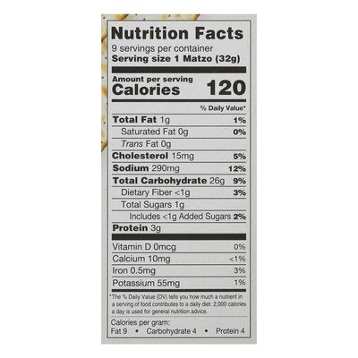 Lightly flavored matzo with onion and a touch of honey. No artificial flavor or color. Comfort food for the soul. Estd 1888. Savory & crisp. Celebrating over 130 years crafting kosher foods. The world's original ancient cracker, simply made with just flour and water. At Manischewitz, we carried the torch forward in bringing matzos to the masses with our world-famous square matzos – a company tradition since 1888. Some things are better unchanged and simple, like matzos - the world's original ancient cracker. Matzo lets your toppings do the talking! The simple, clean flavor and satisfying snap of matzos makes it a versatile backdrop for dips, spreads and creative recipes. Matzo lets your toppings do the talking! The Manischewitz Co. Generations of Kashrus & quality. manischewitz.com. Facebook. Pinterest. (at)manishcewitz. Twitter. Instagram (at)manischewitz.co. Visit us at: manischewitz.com. Enjoy Manischewitz Egg Matzos and other delicious Manischewitz products that are available all year round: Matzo Ball & Soup Mix. Potato Pancake Mix. Gluten Free Noodles. Tam Tam Crackers. Organic Matzo. Broths & Soups. Printed on recycled paperboard. Product of Israel.