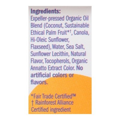 No artificial ingredients or flavors. USDA Organic. No dairy. No nuts, soy or gluten. Certified Organic by QAI. High in omega 3. 1/2 the saturated fat than dairy butter. Non-GMO Project verified. nongmoproject.org. Melt Organic Spread: Butter with Benefits. Sure it comes from plants, but there is nothing plant-based about the taste. Butter you can believe-in good for you, your food; and the planet. The Perfect Blend: coconut; flaxseed; sunflower; palm fruit. canola. nongmoproject.org. meltorganic.com. Fair Trade Certified: Palm oil. Rainforest Alliance Certified. Product of USA.