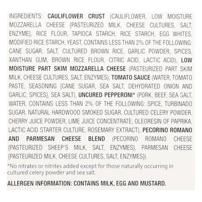 Premium uncured pepperoni, mozzarella, Romano & Parmesan cheeses with a zesty tomato pizza sauce. Certified gluten free. gfco.org. (Certified Gluten-free by the gluten-free certification organization, www.gluten.org). rBST free. Cheese from milk of cows and sheep not treated with rBST. No significant difference has been shown between milk derived from rBST-treated and non-rBST-treated cows and sheep. Satisfy your pizza cravings with the amazing flavor of Milton's Uncured Pepperoni Cauliflower Crust Pizza. Our signature, Thin & Crispy Cauliflower Crust is generously topped with Premium uncured pepperoni (no nitrates or nitrites added except for those naturally occurring in cultured celery powder and sea salt), a zesty Roma tomato pizza sauce, and real Mozzarella, Romano and Parmesan cheeses - delivering pizzeria quality right from your oven, so you can Share the Joy of Eating Well. 100% Delicious Cauliflower Crust: Our thin & crispy cauliflower crust is 100% gluten free and most notably - it's a delicious, authentic pizza crust like no other! A flavorful pizza that everyone can enjoy: Certified Gluten free, so that you can serve and share with all your family and friends. rBST Free: We use real Mozzarella, Romano and Parmesan cheeses that are made from milk that is not rBST growth hormone supplemented. Uncured Artisan Pepperoni: Our uncured pepperoni (no nitrates or nitrites added except for those naturally occurring in cultured celery powder and sea salt) is a true, love at first bite experience. It's crafted using the most premium cuts of vegetarian-fed pork and grass-fed beef, raised without antibiotics and uncured with no nitrates or nitrites added (no nitrates or nitrites added except for those naturally occurring in cultured celery powder and sea salt). It's delicious you can feel good about! Satisfaction guaranteed. U.S. inspected and passed by Department of Agriculture. MiltonsCraftBakers.com. Facebook: Facebook.com/MiltonsCraftBakers. Instagram: Instagram.com/MiltonsCraftBakers. Please recycle.