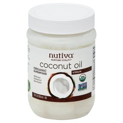 Nurture vitality. Organic superfood. 100% less cholesterol than butter. USDA organic. Non GMO Project verified. nongmoproject.org. Coconut is one of the world's most nourishing foods. This creamy taste of the tropics is great for sautéing and baking, enhancing your favorite recipes, and body care. Simply Pure: Cold-pressed and unrefined. Savor the rich aroma and enticing light taste. A pinch of salt reduces the coconut flavor in savory recipes. Contains 62% medium chain triglycerides (MCTs) along with lauric and caprylic acids. Organic: Made without pesticides, GMOs or hexane. Versatile: Ideal as a medium heat cooking oil (up to 350 degrees F) and is better than butter on bread, vegetables or popcorn. A nutritious substitute in baking, and great for skin care, hair care and massage. For delicious recipes, visit nutiva.com. 1% of sales go to sustainable agriculture $3 million+. Vegan. Non-GMO. 0 g trans fat. Non-BPA container. No hexane. Non-hydrogenated. 62% MCTs. Note: Any brown specks are natural to coconut. Certified B corporation. Facebook. Twitter. www.nutiva.com. Certified organic by QAI and Ecocert ICO (US-ORG-016). Product of Philippines, India and Sri Lanka.