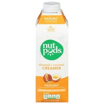 Naturally flavored with other natural flavors. 0 g sugar per serving. Per 1 Tbsp: 10 calories; 0 g sat fat (0% DV). 0 mg sodium (0% DV); 0 g total sugars. Unsweetened & dairy-free. Certified gluten free. Vegan. Keto friendly. Paleo friendly. Carrageenan-free. Non-GMO Project verified. nongmoproject.org. Plant pack. Rethink your coffee ritual. nutpods was born out of my personal search for a dairy-free creamer that still had the rich taste and consistency of half and half without the unnecessary additives or added sugars. Creating nutpods was one small change that made my life better. I'm so proud that you can now enjoy your favorite cup of coffee or tea exactly as you like it. Happy sipping, - Madeline, mom and founder. Plant-based. Smooth. Balanced. Delicious. Whole 30 Approved. nutpods.com/hello. Facebook. Instagram. Twitter. (at)nutpods. We would love to hear from you! nutpods.com/hello. SIG combidome. Please recycle. FSC: Mix - Board.