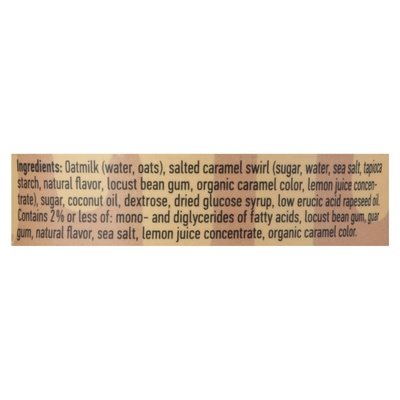 Caramel non-dairy frozen dessert with salted caramel swirl. Certified Gluten free. gfco.org. 100% vegan. Certified Vegan. vegan.org. No dairy. No nuts. No gluten. Non GMO Project verified. nongmoproject.org. Wow no cow! 97% Biobased verified by ASTM D6866. www.oatly.com. Please recycle. Sustainable Forestry Initiative: Certified sourcing. www.sfiprogram.org. Product of Canada.