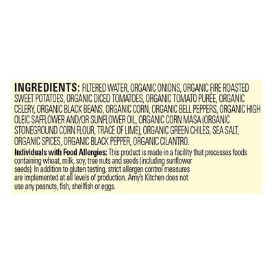 Tortilla with fire roasted sweet potatoes. Certified Organic: Quality Assurance International. Certified vegan. Vegan.org. USDA Organic. Gluten free. No GMOs - No genetically engineered ingredients. Plant based. Ready to serve. Inspired by Mexican flavors, our chef came up with Amy's take on this classic soup. Organic sun-ripened tomatoes, corn masa, bell peppers, black beans and fire roasted sweet potatoes combined with organic spices make our Organic Tortilla Soup distinctive and delicious. Amy's Kitchen was started when our daughter Amy was born in 1987. We are a family business deeply committed to producing convenient organic foods made with the highest quality ingredients. amys.com. how2recycle.info. We love to hear from you. amys.com. Non-BPA lining.
