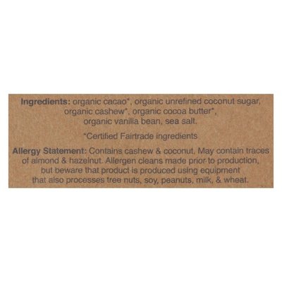 Cashew butter + pure vanilla bean dark chocolate. USDA Organic. Certified vegan. Vegan.org. Certified Paleo. Certified gluten free. Certified Organic by NFC. No refined sugar. No cane sugar. No dairy/soy. No sugar alcohols. No erythritol. No palm oil. No lecithins. No vanilla extract. Non-GMO Project verified. nongmoproject.org. Get back to human. It's time to get back to the way humans ate before industry ruined food. Organic fairtrade 70% cacao. hukitchen.com. (at)hukitchen. Certified Fair Trade by FLOCert. Fairtrade cocoa, cashew: mass balance is used to match fairtrade sourcing, total 63%. Visit info.fairtrade.net/sourcing.
