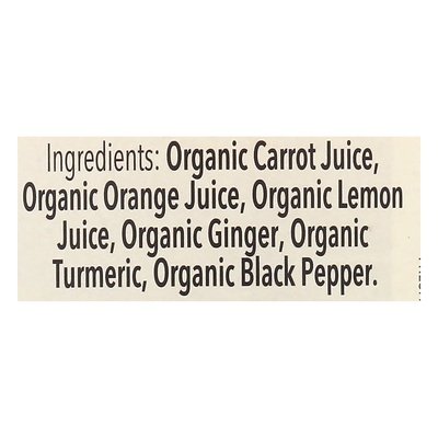 USDA Organic. Certified Organic by Quality Certification Services (QCS). 100% vegan. Gluten free. Non GMO. Nourishing since 1935. Not from concentrate juice blend. Fresh pressed. With organic orange juice. Feel good. Live good. Pasteurized juice squeezed from fresh vegs & fruits. Unsweetened. No preservatives. Allergen free. Casein free. What's in the Bottle: 3 lbs. organic carrots with orange, lemon, ginger, turmeric and black pepper. Family owned and operated since 1935. Consumer Note: This organic carrot product contains organic lemon juice, allowing the juice to be bottled without the use of preservatives, juice products will settle. www.lakewoodorganic.com Facebook. Instagram. Pinterest. Glass recycles. All glass BPA/BPS/DEHP free.