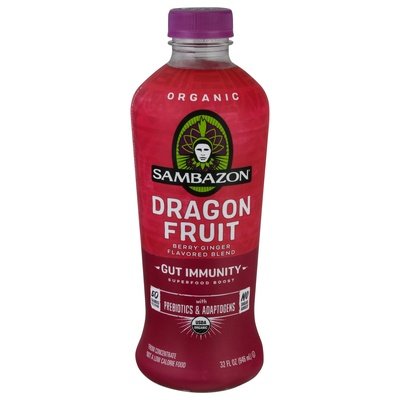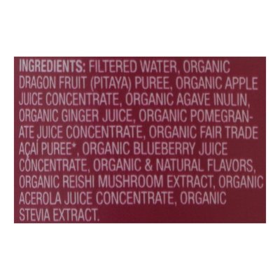 Berry (from concentrate) ginger flavored blend. 50 calories per serving. USDA Organic. Certified Organic by QAI. Vegan & gluten free. No sugar added (Not a low calorie food). Each Serving Contains: Good source of prebiotic fiber; Good source of antioxidants (vitamin C); 100 mg reishi mushroom extract; 6 types of fruits. Non GMO. Gut immunity. Superfood boost with prebiotics & adaptogens. Superfruits. Super good. A sugar and calorie-conscious Superfruit boost that is as delicious as it is nutritious for the entire family. Organic Superfruits paired with Prebiotics and Adaptogens support inner strength, gut health and vibrant well-being. Certified thetri.org. www.sambazon.com. Our pledge, your impact. We're committed to protecting the Amazon. Please join us in: Rainforest protection; Endangered species; Building schools; Fair wages. Tear off label and recycle bottle. This bottle is made of Post Consumer Recycled PET. Please recycle me, again! 1. Empty bottle & remove label. 2. Replace cap & recycle. Made in USA.