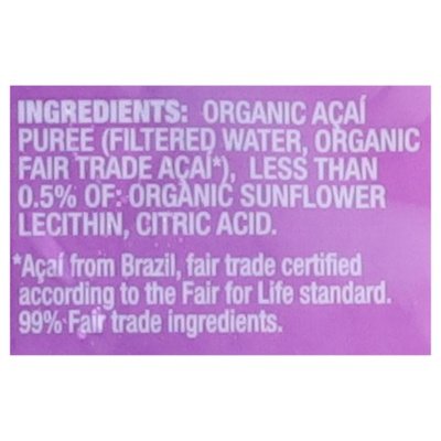 Zero sugar. USDA Organic. Vegan. Gluten-free. Keto certified. Certified Organic by QAI. Not a low calorie food. Non-GMO. Discover Acai (ah-sigh-ee). The Amazon Superfood. The Acai berry is wild harvested from palm trees along the riverbanks of the Brazilian Amazon Rainforest. It contains anthocyanins (like blueberries and red wine) and healthy omegas 3,6,9 (This product has 3232 mg Omegas 3,6,9 per serving) (like avocado and olive oil). This Amazon Superfood is the perfect addition to your smoothie or bowl to supercharge your day. - Taste the delicious powers of Acai! The first certified fair trade & organic Acai company. Certified thetri.org. www.sambazon.com. Visit sambazon.com for more recipes. Fair for Life: Fair trade certified by IMO. Our pledge, your impact. Did you know that over 20% of the world's oxygen is produced in the Amazon rainforest? Every time you enjoy Sambazon Acai, you're helping protect the Amazon's incredible biodiversity and directly giving back to family farmers who harvest wild Acai with us. Here are a few ways you're driving positive impact: Rainforest protection; Endangered species habitat conservation; Building schools & clean water systems; Fair wages & labor practices. Made in Brazil.