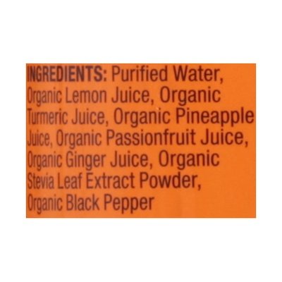Purified water, lemon, turmeric, pineapple, passion fruit. No preservatives. No added flavors. 2 g sugar. USDA Organic. Organic. Vegan. Gluten free. Non-GMO Project verified. nongmoproject.org. Spice Up Your Life: Suja is made sunny in San Diego, where we pick our favorite local fruits and veggies and then chill then out with cold pressure to keep them feeling fresh and tasting delicious. We bottle up the power of plants so you can make nutrition your bliss! High pressure certified. sujajuice.com/hpp. Follow (at)lovesuja.