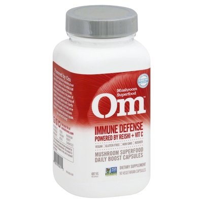 Dietary Supplement. Powered by reishi + vit C. 697 mg per capsule. 2,000 mg per serving. Vegan. Gluten free. Non GMO. Non GMO Project verified. nongmoproject.org. Kosher. Certified kosher by EarthKosher. Mushroom superfood daily boost capsules. Mushroom superfood. Great daily defenses. Immune support. 30 day supply. Om Immune Defense. Powered by reishi + vitamin C. Guard your wellness with Reishi, an adaptogen known to help keep the body balanced plus Vitamin C for holistic immune support. Why Mushrooms? Did you know? Mushrooms are truly a unique superfood. They contain many bioactive nutrients that we have a hard time getting from plant or animal sources. Each serving of Om provides 2,000mg of Mushroom Power: whole food nutrition; beta glucans and prebiotics. no added sugars or fillers. Powered by Om: At Om, we grow functional mushrooms at our indoor farm in California. They contain a full spectrum of active compounds, the way nature intended. We believe in the power of the whole food mushroom and its full array of benefits to support optimal health. Expertly crafted to elevate the mind and body, we've harnessed the benefits of the mushroom kingdom in a convenient daily boost capsule. Enjoy and feel Om-Azing! No synthetic or artificial ingredients. Tested for heavy metals. Mushroom identity guaranteed. Find your Om at ommushrooms.com. Instagram. Facebook. Twitter. (These statements have not been evaluated by the Food and Drug Administration. This product is not intended to diagnose, treat, cure, or prevent any disease.) USA grown mushrooms.