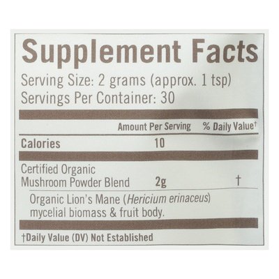Dietary Supplement Powder. 2,000 mg per serving. OM grown. Mushroom blend (see supplement facts). USDA Organic. Certified organic by Organic Certifiers. Gluten free. Vegan. Keto-friendly. Paleo-friendly. Non-GMO Project verified. nongmoproject.org. 30 servings. Mushroom superfood. Memory. Focus. Nerve health. The superfoodie of superfoods. Mushrooms contain many unique bioactive nutrients that can't be found in plant or animal sources alone. Each serving of Om provides 2,000mg of Certified Organic Mushroom Powder Blend. Mushroom your microbiome. Functional without anything funky added. No nutrients left behind. Lion's mane the smartest mushroom in the kingdom. Mentally speaking, it doesn't get better than Lion's Mane. This smart vegan mushroom may look like the flowing mane of a lion, but it tastes like a warm cuppa mental clarity. It's a brain health superfood that helps support memory, focus, nerve health, creativity and mood. Just brilliant. No artificial or synthetic ingredients. Tested for heavy metals. Complete transparency ID testing. We grow our OM. We grow a diverse range of organic mushroom species at our indoor farm in California and capture the complete nutritional value of the growing cycle. Whole food mushrooms are important because they provide a full spectrum of active compounds to support optimal health. So you can bet your beta glucans they're effective. Contents packed by weight not by volume. Some settling may occur. Mushrooms are our mantra. Ommmmm. Ommushrooms.com. nongmoproject.org. (at)ommushrooms. More Mushroom Ideas: Ommushrooms.com. What's a beta glucan? Find out at Ommushrooms.com. (These statements have not been evaluated by the FDA. This product is not intended to diagnose, treat, cure or prevent any disease.) Grown in USA.