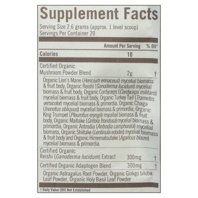 Dietary Supplement. 2,000 mg per serving. OM grown. Mushroom blend (see supplement facts). USDA Organic. Certified organic by Organic Certifiers. Gluten free. Vegan. Keto-friendly. Paleo-friendly. Non-GMO Project verified. nongmoproject.org. Superfood beta glucans. 10 mushroom species. 3 botanical adaptogens for optimal performance & vibrant health (These statements have not been evaluated by the Food and Drug Administration. This product is not intended to diagnose, treat, cure or prevent any disease). Certified organic mushroom powder+ botanicals. Om Master Blend: Supercharge your daily health with Om's unique Mushroom Master Blend. 10 species of organic functional mushroom powders containing a full spectrum of naturally occurring active compounds, plus our proprietary organic Reishi extract with more than 25% beta glucan content in addition to the beta glucans in each of the mushroom species, plus organic botanical adaptogens. It's a powerful master blend for vibrant health (These statements have not been evaluated by the Food and Drug Administration. This product is not intended to diagnose, treat, cure or prevent any disease). Lion's Mane: Supports memory, focus, clarity and nerve health (These statements have not been evaluated by the Food and Drug Administration. This product is not intended to diagnose, treat, cure or prevent any disease). Reishi: Helps manage occasional physical and mental stress (These statements have not been evaluated by the Food and Drug Administration. This product is not intended to diagnose, treat, cure or prevent any disease). Cordyceps: Helps elevate energy, vitality and endurance (These statements have not been evaluated by the Food and Drug Administration. This product is not intended to diagnose, treat, cure or prevent any disease). Turkey Tail: One of the most researched functional mushrooms for immune health support (These statements have not been evaluated by the Food and Drug Administration. This product is not intended to diagnose, treat, cure or prevent any disease). Chaga: Helps outsmart free radicals for healthy aging at any age (These statements have not been evaluated by the Food and Drug Administration. This product is not intended to diagnose, treat, cure or prevent any disease). King Trumpet: Contains master antioxidant L-Ergothioneine a naturally occurring amino acid found only in a few sources (These statements have not been evaluated by the Food and Drug Administration. This product is not intended to diagnose, treat, cure or prevent any disease). Maitake: Helps support gut health and healthy blood sugar (These statements have not been evaluated by the Food and Drug Administration. This product is not intended to diagnose, treat, cure or prevent any disease). Antrodia Camphorata: Researched for its immune and liver health support (These statements have not been evaluated by the Food and Drug Administration. This product is not intended to diagnose, treat, cure or prevent any disease). Shiitake: Not just a tasty culinary mushroom! This mushroom has many functional benefits including detox support (These statements have not been evaluated by the Food and Drug Administration. This product is not intended to diagnose, treat, cure or prevent any disease). Agaricus Blazei: Sometimes called the Mushroom of Life. Known for its beneficial polysaccharide compounds (These statements have not been evaluated by the Food and Drug Administration. This product is not intended to diagnose, treat, cure or prevent any disease). Botanical Adaptogens: Astragalus, Ginkgo biloba, and Holy Basil used in traditional medicine to help manage occasional stress, inflammation and support immune health, cognitive health and energy levels (These statements have not been evaluated by the Food and Drug Administration. This product is not intended to diagnose, treat, cure or prevent any disease). Certified organic by organic certifiers. OmMushrooms.com. Facebook. Instagram. (at)ommushrooms & OmMushrooms.com. For more information, please visit OmMushrooms.com. Packaged with recycled materials. These statements have not been evaluated by the Food and Drug Administration. This product is not intended to diagnose, treat, cure or prevent any disease. Grown in the USA.
