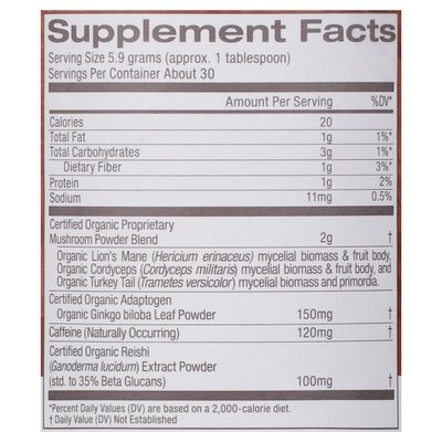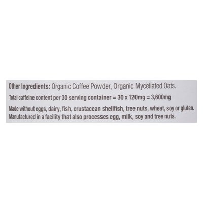 Dietary Supplement Powder 30 serving. Energizing Coffee Latte Blend with lion's mane, cordyceps, turkey tail, reishi extract & ginkgo biloba. Om grown 2,000 mg per serving mushroom blend (See supplements facts). USDA Organic. Gluten Free. Vegan. Certified kosher by earth kosher. Certified organic by organic certifiers. Contains caffeine. Mushroom superfood. Focus. Immunity. Energize. Immune support. Lions Mane, cordyceps, turkey tail, reishi extract & ginkgo biloba. Powerful Superfoods: Single origin, 100% Arabica coffee sustainably grown in Papua New Guinea with bold chocolatey notes and a rich full bodied taste. Combined with organic Lion's Mane, Cordyceps, Turkey Tail and Reishi superfood mushrooms plus Ginkgo biloba for focus and vibrant health. Each serving of Om Mushroom Coffee Blend contains 2,000mg of certified organic whole food mushroom powder +100mg of Organic Reishi whole food extract standardized to 35% Beta Glucans. Lion's mane-the smart mushroom: helps support memory, focus, nerve health, creativity and mood. Cordyceps-performance mushroom: originally discovered and used by tibetan herdsmen at high altitudes to help support physical energy, vitality, stamina and endurance. Turkey tail-your immune defense: A vegan mushroom with immune supporting benefits. One of the most researched functional mushrooms for its powerful polysaccharides. Reishi-shroom away stress: an adaptogen revered by traditional herbalists for its ability to help the body cope with everyday physical and mental stress by restoring balance and immune health. Ginkgo biloba-cognitive support: for thousands of years, leaves from the ginkgo biloba tree have been used routinely in chinese medicine to help support cognitive health, such as memory and focus. Total caffeine content per 30 serving container = 30 x 120mg = 3,600mg OmMushrooms.com. Smartlable: Scan code to learn more. Facebook. Instagram. (at)OmMushrooms. Biodegradable canister. Biodegradable canister. (These statements have not been evaluated by the Food and Drug Administration This product is not intended to diagnose, treat, cure, or prevent any disease)