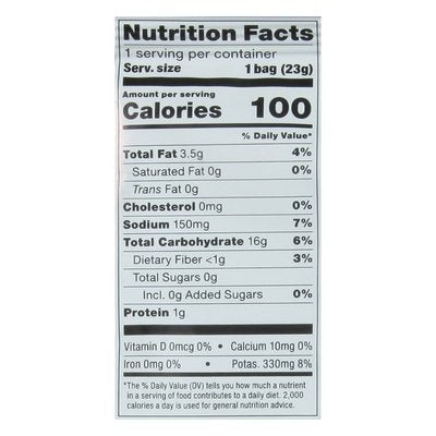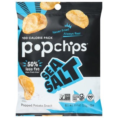 100 calories per bag. Certified gluten free. Certified vegan. Vegan.org. 50% less fat than fried chips (50+% less fat per 28g serving barbeque popchips regular fried potato chips). Non-GMO Project verified. nongmoproject.org. Never fried. Always real. Simply sea salt, simply delicious. The classics stand the test of time - and taste buds. For example, combining potatoes and sea salt dates back to the year 1000 BC, or before chips. Clearly, these simple ingredients bring out the best in each other, and they'll bring out the snacker in you. Popped to perfection. Many chip-years ago, we turned the potato chip world upside down. We chose heat and pressure instead of grease and the deep fryer to create The Original Pop. The rest is delicious history. So grab a bag and enjoy, without snackrifice. Guaranteed fresh and flavorful through the best before date any questions visit popchips.com. popchips.com. Any questions visit popchips.com.