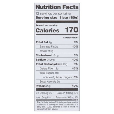 Flavored with other natural flavors. 20 g protein. 4 g net carbs (24 total carbs - 12 g fiber - 9 g sugar alcohols = 4 g net carbs). Less than 1 g sugar per bar. See nutrition facts for calories content. Certified gluten free. gfco.org. Contains a bioengineered food ingredient. questnutrition.com. (at)questnutrition. (hashtag)onaquest. Instagram. Facebook. Twitter. YouTube.