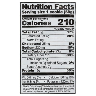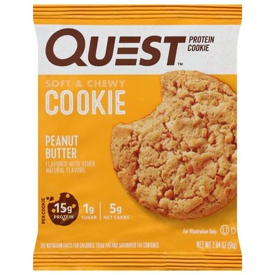 Flavored with other natural flavors. Per Cookie: 15 g protein; 1 g sugar; 5 g net carbs (23 g total carbs - 11 fiber - 7 g sugar alcohols = 5 g net carbs). No gluten containing ingredients. See nutrition facts for calories, total fat and saturated fat contents. For illustration only. What's your Quest? Ours is to support you with delicious, athlete-worthy nutrition. It's way bigger than a protein cookie. It's a Quest. questnutrition.com.