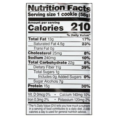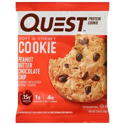 Peanut butter chocolate chip flavored with other natural flavors. Per Cookie: 15 g protein; 1 g sugar; 4 g net carbs (22 g carbs - 11 g fiber - 7 g sugar alcohols = 4 g net carbs). See nutrition facts for calories, total fat and saturated fat contents. No gluten containing ingredients. What's you Quest? Our is to support you with delicious, athlete-worthy nutrition. It's way bigger than a protein cookie. It's a Quest. questnutrition.com. Made in USA with domestic and imported ingredients.