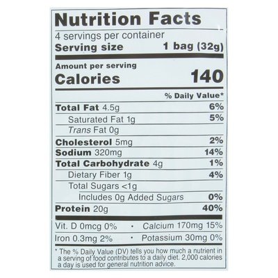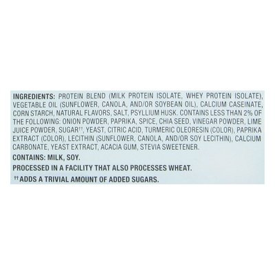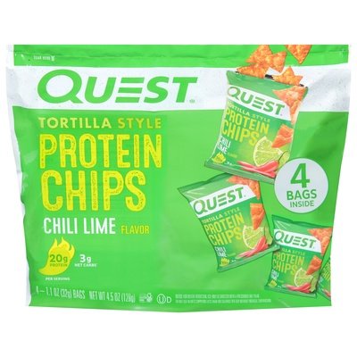 20 g protein. 3 g net carbs (4 g total carbs - 1 g fiber = 3 g net carbs) per serving. Certified gluten free. gfco.org. Gluten free. No added soy ingredients. Contains a bioengineered food ingredient. 4 bags inside. Quest Nutrition is on a mission to make the foods you crave work for you not against you. Want a tangy, spicy tortilla chip you can enjoy anytime? Lucky you! We made Quest chili lime tortilla style Protein Chips to feed your flavor cravings. Baked never fried. Adds a trivial amount of added sugars. questnutrition.com. Follow us (hashtag)onaquest. Instagram. Facebook. Twitter. YouTube. (at)questnutrition