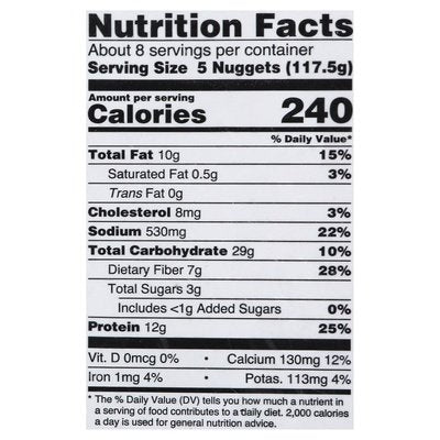 Per 1 Patty Serving (117.5 g): 240 calories; 0.5 g sat fat (3% DV); 530 mg sodium (22% DV); 3 g sugars; 7 g fiber (28% DV); 12 g protein (25% DV). Soy-free. Excellent source of protein. See nutrition information for sodium content. Suitable for vegetarian. Non-GMO. Proudly meat free. Deliciously nutritious. Love cooking with Quorn. Our Meatless Nuggets are sure to be loved by the whole family as a snack or meal. Sustainable Nutrition: At Quorn, we produce our own unique protein called Mycoprotein (Mycoprotein: Mycoprotein is a mold (member of the fungi family). There have been rare cases of allergic reactions to products that contain Mycoprotein), which is a unique blend of protein and fiber. Producing Mycoprotein (Mycoprotein: Mycoprotein is a mold (member of the fungi family). There have been rare cases of allergic reactions to products that contain Mycoprotein) uses less land and water than animal protein production, so it's better for the planet too! We think it is great - but if you're not totally happy. Please return all packaging to Quorn Foods Inc. PO Box 10789, Chicago, IL 60610. www.quorn.us. Facebook. Twitter. Instagram. For delicious recipe inspiration, to discover other Quorn products, and to find out more about our approach to sustainable nutrition, visit www.quorn.us. Product of the United Kingdom.