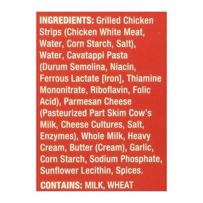 White meat chicken in a creamy alfredo sauce over pasta. No preservatives, no artificial colors or flavors. Since 1896. Made for home. Over 120 years in the making bring home the taste of our rich and creamy Chicken Alfredo. Tender, grilled chicken is served on a bed of al dente cavatappi pasta, generously covered in sauce, and topped with parmesan and parsley. Inspected for wholesomeness by US Department of Agriculture. www.raos.com.