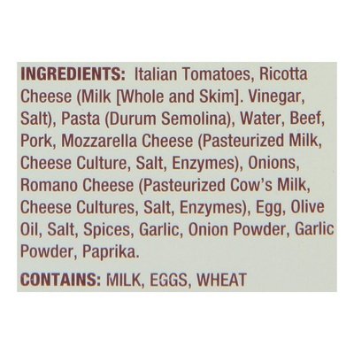Pasta layered with ricotta, mozzarella, beef, pork & marinara sauce. No preservatives, no artificial colors or flavors. Since 1896. Made for home. Over 120 years in the making. Bring home the taste of our irresistible 3-layer Meat Lasagna. Snuggled between every layer of bronze cut pasta is our delicious marinara and meat sauces with a fresh ricotta and Romano cheese filling. It's packed with garlic, basil and parsley, and topped with mozzarella. U.S. inspected and passed by Department of Agriculture. www.raos.com.