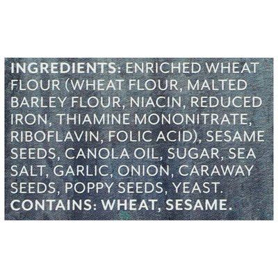 Toasted everything flatbread with poppy, sesame, caraway seeds, garlic and onion. Non-GMO Project verified. nongmoproject.org. Est 1934. Savory and flavorful. Light and crisp. Roland Toasted Everything Flatbreads are crisp flatbreads that are made in small batches, using only the finest ingredients. The dough is cut into long rectangular strips, then topped with a savory blend of garlic, onion, sesame, poppy, and caraway seeds, adding the perfect balance of flavor into every bite. Our flatbreads are excellent as a quick snack or on cheese boards and charcuterie. www.rolandfoods.com. Product of USA.