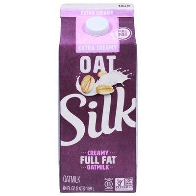 Creamy full fat (Silk oat extra creamy has 9g fat per cup; Silk oat original has 5g fat per cup) oatmilk. Free from artificial colors & flavors. Certified vegan. Vegan.org. Free from: dairy, gluten, carrageenan, cholesterol, soy, artificial colors, artificial flavors. Full fat. Non-GMO Project verified. nongmoproject.org. We believe in making delicious plant-based food. That does right by you and fuels our passion for the planet. To make your journey smooth. Silk grow on. Creamy planet-consciouss deliciousness you can dunk a cookie into. We restore water to rivers drop for drop putting back what is used to grow our oats. bcorporation.net. silk.com/loveit. how2recycle.info. Facebook. Instagram. Twitter. For more on sustainability visit silk.com. Certified B Corporation. Danone: Proud Member of the Danone Family. FSC: Mix.