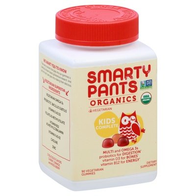 Dietary Supplement. USDA Organic. Certified Organic by QAI. Vegetarian. AVA: Certified Vegetarian. American Vegetarian Association. Non GMO Project verified. nongmoproject.org. Multi and omega 3s probiotics for digestion. Vitamin D3 for bones. Vitamin B12 for energy. Free of: Gelatin, soy, synthetic colors, artificial flavors and preservatives, yeast, wheat, milk, eggs, gluten, peanuts, tree nuts, fish, shellfish, and salicylates. Yay! Every batch 3rd party lab tested. Vitamins Angels: Product supporter. 1 for 1 partner. We Want You to Know: That every nutrient that goes into our gummies is carefully chosen based on extensive research. And just as much care goes into making them delicious. Vegetarian Superstar Ingredients: Vegetarian omega 3s. Probiotic bacillus subtilis. Vitamin D as D3. Folate as methylfolate. Vitamin B12 as methylcobalamin. Vitamin K as K2. Choline. Zinc. 3 Delicious Flavors: Cherry, orange, and mixed berry. www.SmartyPantsVitamins.com. Instagram: (at)SmartyPants. For Customer Support: 1-888-751-2291. This bottle contains 80% post-consumer recycled material, and its label is printed on FiberStone tree-free/water-free paper made from stone. (These statement has not been evaluated by the Food and Drug Administration. This product is not intended to diagnose, treat, cure, or prevent any disease.) Manufactured in Canada and packaged in California.