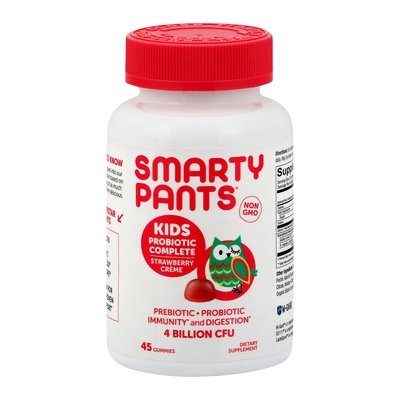 Dietary Supplement. Free of GMOs, gelatin, synthetic colors, artificial flavors and preservatives, wheat, milk, eggs, soy, gluten, peanuts, tree nut allergens, fish, shellfish, and salicylates. Yay! Certified Vegan. American Vegetarian Association. Non GMO. Prebiotic. Probiotic. Immunity and digestion. 4 billion CFU. We want you to know that every nutrient that goes into our gummies is carefully chosen based on extensive research. And just as much care goes into making them delicious. Every batch 3rd party lab tested. www.SmartyPantsVitamins.com. Instagram. (at)SmartyPants. For Customer Support: 1-888-751-2291 Hoot(at)SmartyPantsCorp.com. Vitamin Angels Proud Supporter: 1 for 1 partner. (These statements have not been evaluated by the Food and Drug Administration. This product is not intended to diagnose, treat, cure, or prevent any disease.) Manufactured in Canada and packaged in California.