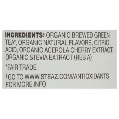 Flavored. USDA Organic. Organic. Certified Organic by Quality Assurance Int'l. Certified Vegan. vegan.org. Zero calorie. 65 mg Caffeine per can from Green Tea. Zero. Antioxidant (Go to www.steaz.com/antioxidants for more info). Brew. We believe in a new brew of tea, one steeped in tradition that refreshes the mind, body, and soul. Premium fair trade organic green tea combined with bold flavors & acerola superfruit, delivers a truly delicious antioxidant brew. Non-carbonated. steaz.com. Facebook. Twitter. Pinterest. Instagram. 1% For the planet.