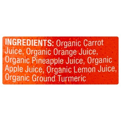 Carrot. Orange. Pineapple. Apple. Lemon. No added flavors. USDA Organic. Certified Organic by CCOF. Vegan. Gluten free. Non GMO Project verified. nongmorproject.org. Cold-pressed. Keep calm & carrot on. Suja is made sunny in San Diego, where we pick our favorite local fruits and veggies and then chill them out with cold pressure to keep them feeling fresh and tasting delicious. We bottle up the power of plants so you can make nutrition your bliss! No added preservatives. High Pressure certified. sujachoice.com/HPP. Follow (at)lovesuja. Please recycle.