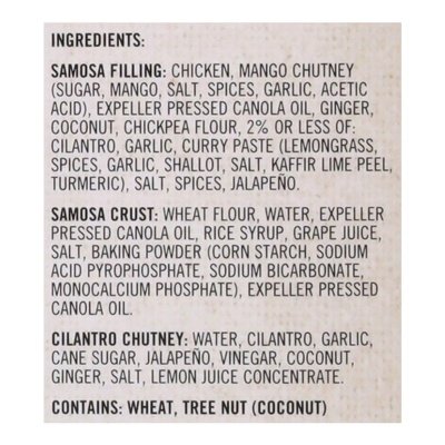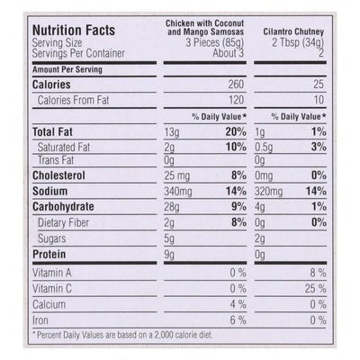 Crispy handcrafted wraps with spiced chicken, mango & coconut. Certified Halal (Certified by the Islamic services of America www.isahalal.com). Chicken used raised with: No antibiotics ever. No added hormones (Federal regulations prohibit the use of hormones in poultry). No preservatives added. Irresistible indian cuisine. Cilantro chutney included. Fully cooked. Approx 8 pieces. Sukhi's mango-coconut chicken samosas make an appetizing side dish or snack. We've included our delectable cilantro chutney for dipping. Perfectly sized for party platters they will spice up any gathering of family or friends. Now it's easy to share Sukhi's irresistible flavors anytime! Chicken used has no added antibiotics or hormones (Federal regulations prohibit the use of hormones in poultry). No preservatives added. There are two types of people: people who love Indian cuisine and the people who just haven't tried it yet. Come into my kitchen and fall in love. Sukhi Singh. Inspected for wholesomeness by U.S. Department of Agriculture. www.sukhis.com. Follow us! Facebook. Instagram. Pinterest. Twitter. For more products and serving ideas. www.sukhis.com. Made in the USA.