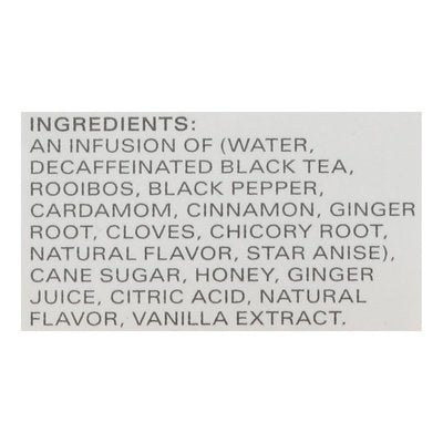 Black tea concentrate. Per 3/4 Cup Concentrate: 90 calories. Discover a rich decaffeinated blend of black tea, cinnamon, ginger, cardamom & vanilla flavor. We’ve got our won thing brewing. We’re on a quest to be the most unexpected tea makers. We’re always curious. Always questioning. What’s this flavor? What’s that aroma? We love to dive in and stir things up. We’re half curious kid, half intrepid explorer, half undaunted alchemist. Yes - one and a half. That spirit? We bring it to tea. We do it through unexpected blends with a twist so you can taste the vibrant undiscovered flavors the world has stashed away. We get the pretty intense when it comes to discovering the best tasting teas and richest spices from around the world. Our Decaf Chai Latte is the warmest, richest result of all that tireless questing, featuring the boldest black teas blended with spiced notes of cinnamon, cardamom and ginger plus creamy vanilla flavor. how2recycle.info. tazo.com.