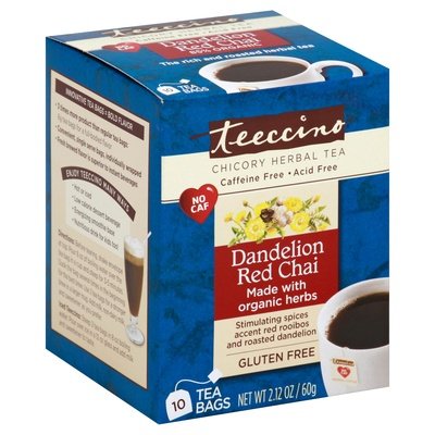 Stimulating spices accent red rooibos and roasted dandelion. Caffeine free. Acid free. No Caf. 100% naturally caffeine-free. Natural Energy Boost - from nutrients, not stimulants. Acid free - helps restore alkaline balance. Heart-healthy potassium - for optimal performance. Soluble fiber - inulin in chicory root, supports beneficial intestinal flora that improve digestion and elimination. Made with organic herbs. 85% organic. Gluten free. Certified gluten-free by the Gluten Intolerance Group of North America. Certified organic by QAI. Certified Organic by Quality Assurance International. The Rich and Roasted Herbal Tea: Whether you’re a tea or coffee drinker, you'll love Teeccino's satisfying, robust flavor that fans describe as smoother, richer, and creamier than coffee. The secret? French chicory, the roasted root often added to coffee, blended with dandelion, the renowned detox herb, and Spanish carob. famed for its chocolaty flavor. Enriched with South Africa's rooibos and pungent spices, Teeccino makes a delicious cup of tea - or is it coffee? We'll let you decide! Innovative Tea Bags = Bold Flavor. 3 times more product than regular tea bags: 6 g tea bags for a full-bodied flavor. Convenient, single serve bags, individually wrapped. Fresh brewed flavor is superior to instant beverages. Enjoy Teeccino Many Ways: Hot or iced; low calorie dessert beverage; energizing smoothie base; nutritious drink for kids too! www.teeccino.com. Product of the USA.