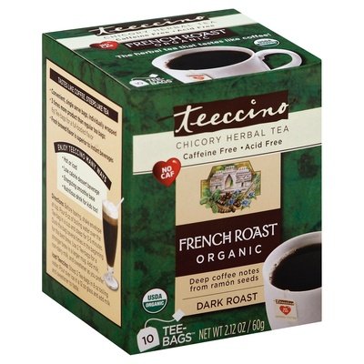 Deep coffee notes from ramon seeds. Dark roast. Caffeine free. Acid free. No caf. USDA organic. The herbal tea that tastes like coffee! Whether you're a tea or coffee drinker, you'll love Teeccino's satisfying, robust flavor that fans describe as smoother, richer, and creamier than coffee. The secret? French chicory, the roasted root often added to coffee, blended with barley, Italy's favorite caffeine-free roasted brew, and Spanish carob, famed for its chocolaty flavor. Enriched with ramon seeds, a traditional Mayan roasted beverage, Teeccino makes a delicious cup of tea - or is it coffee? We'll let you decide! 100% naturally caffeine-free. Natural energy boost - from nutrients, not stimulants. Acid free - helps restore alkaline balance. Heart-healthy potassium - for optimal performance. Soluble fiber - inulin in chicory root, supports beneficial intestinal flora that improve digestion and elimination. Tastes like coffee, steeps like tea. Convenient, single serve bags, individually wrapped. 3 times more product than regular tea bags: 6 g tee-bags for a full-bodied flavor. Fresh brewed flavor is superior to instant beverages. Enjoy Teeccino Many Ways: Hot or iced; Low calorie dessert beverage; Energizing smoothie base; Nutritious drink for kids too! About Gluten: Independent laboratory tests can not detect gluten in brewed Teeccino when using a paper filter or tee-bag. For certified gluten-free herbal teas, drink Teeccino Dandelion flavors. For more information please visit teeccino.com/gluten. Certified organic by QAI. Quality Assurance International certified organic. wwww.teeccino.com. Product of the USA.