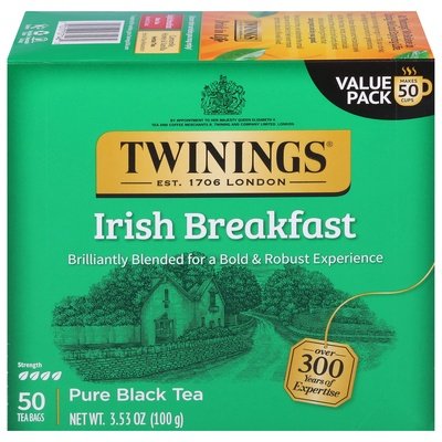 Brilliantly blended for a bold & robust experience. Experience the bold, rich taste of this hearty tea. What does it taste like? A bold tea that's deeply flavourful, rich, and complex. Our strongest black tea. Non-GMO Project verified. nongmoproject.org. Makes 50 cups. By appointment to her Majesty Queen Elizabeth II. Tea and Coffee Merchants R. Twining and Company Limited, London. Est. 1706 London. 50 tea bags. Pure black tea. Over 300 years of experience. At Twinings, we believe in living well and enjoying life. Since our humble beginnings in 1706, our drinks have delighted consumers for generations. Today, our master blenders and herbalists seek out the finest teas, herbs, and botanicals from around the world to brilliantly blend delicious wellbeing drinks that taste great and do you good. One sip at a time, we celebrate the small steps we can all take to feel even more optimistic about a life well-lived. Drink in Life. Sourced with care. Twinings of London. Experience this rich & hearty tea that invigorates you for your day ahead. A tribute to our Irish friends - who love a strong tea & find strength in connecting with others by enjoying a cup together. Our select blend features tea from four distinct regions to create a robust tea. Cheers! Steph Turning Stephen Twining, Master Blender & 10th Generation, Twining Family. Stephen Twining. www.twiningsusa.com. Want to talk tea? Call us at 1-800-803-6695, twiningsusa.com, go to or visit our original English storefront in The Strand, London. Care in Every Drop Every cup starts with nature's finest tea leaves and the people growing, tending, and harvesting them. Our Sourced with Care program works with tea-growing communities to support incomes, improve living standards, and empower women through healthcare and equal access to opportunities. We also collaborate with others in the tea sector, through supporting the Ethical Tea Partnership's work to create a fairer, more sustainable tea industry for tea workers, farmers and their families, as well as the environment. We are a member of ethical tea partnership. Want to find out more? Go to sourcedwithcare.com. Discover other varieties you may enjoy! English Breakfast. Black Tea. Smooth & Classic. Camomile, Honey & Vanilla Herbal Tea. End-of-day relaxation. To explore all 50+ varieties, go to twiningsusa.com. Recyclable carton. Compostable tea bags.